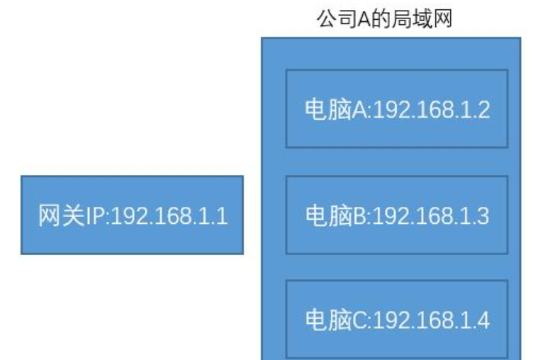 假如我们给这个公司A分配了一个IP=192.168.1.1。我们把这个IP作为这个公司内网的网关吧。