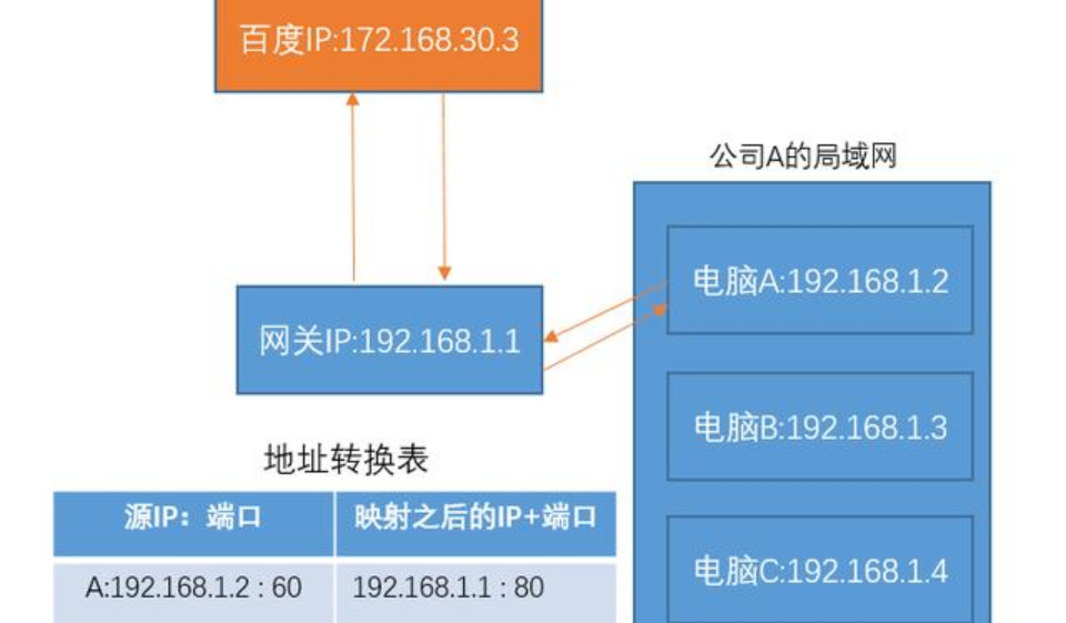 百度把结果返回给网关的80端口之后,网关再通过映射表,就可以把结果返回给 A的60端口 了。