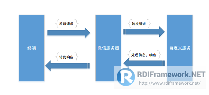 微信服务器就相当于一个转发服务器,终端(手机、桌面应用等)发起请求至微信服务器,微信服务器将请求转发给我们的自定义服务。服务处理完毕,再将处理信息发给微信服务器,微信服务器再将具体响应转发到终端。