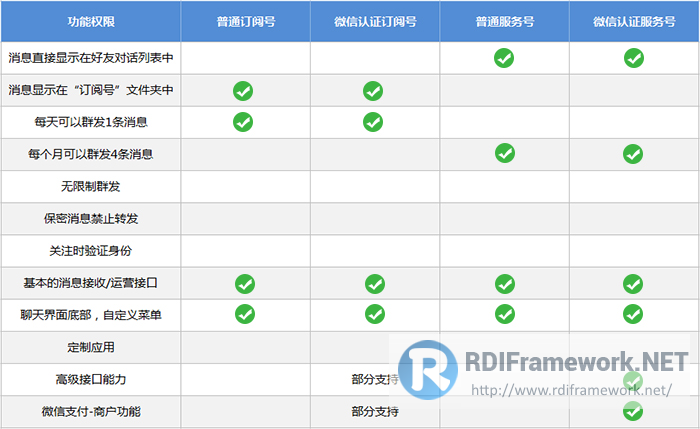 服务号:主要偏向于服务交互(功能类似12315,114,银行,提供绑定信息,服务交互),每月可群发4条消息;服务号适用人群:媒体、企业、政府或其他组织。